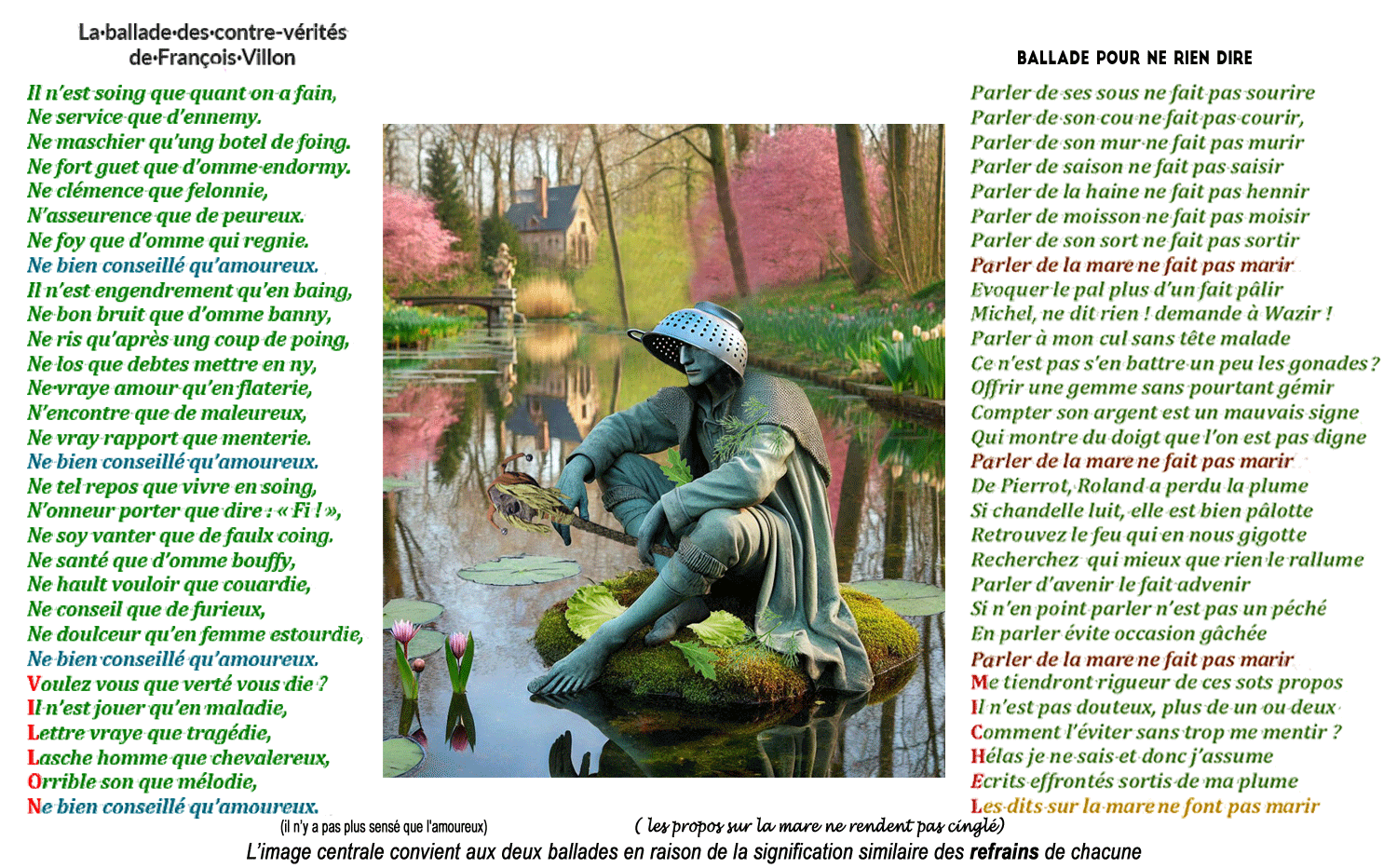 La "ballade pour ne rien dire",  pastiche villonesque de "la ballade des-contre-vérités" a été élaborée dans les premiers mois de 2022, en réaction aux propos échangés entre partisans du report à l'année suivante de la réunion traditionnelle de "la classe", et partisan (sans "S") de son maintien. J'ai un peu édulcoré mon texte initial.