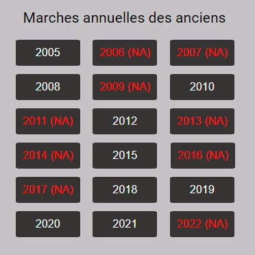 >> Sur le Portail Baghera, cela peut correspondre à des marches auxquelles je n'ai pas participé ou pour lesquelles les photos en ma possession ne sont pas utilisables. (par exemple 2011, le cd que m'a envoyé Louis étant HS). Il peut aussi ne pas avoir eu de marche)